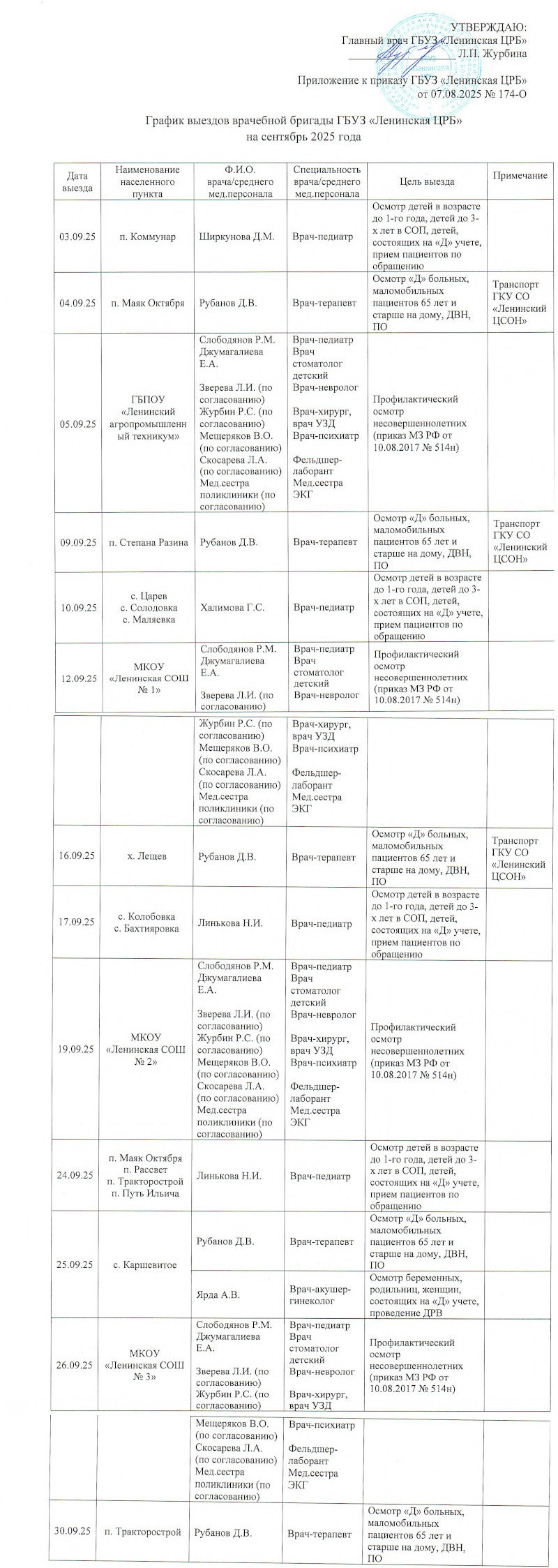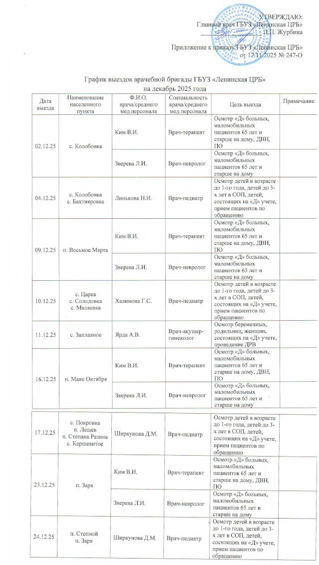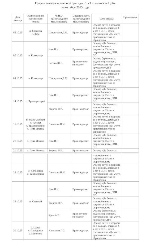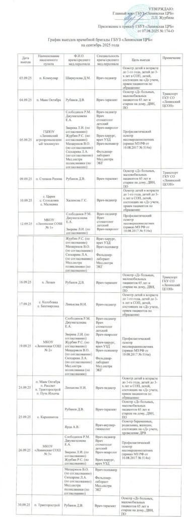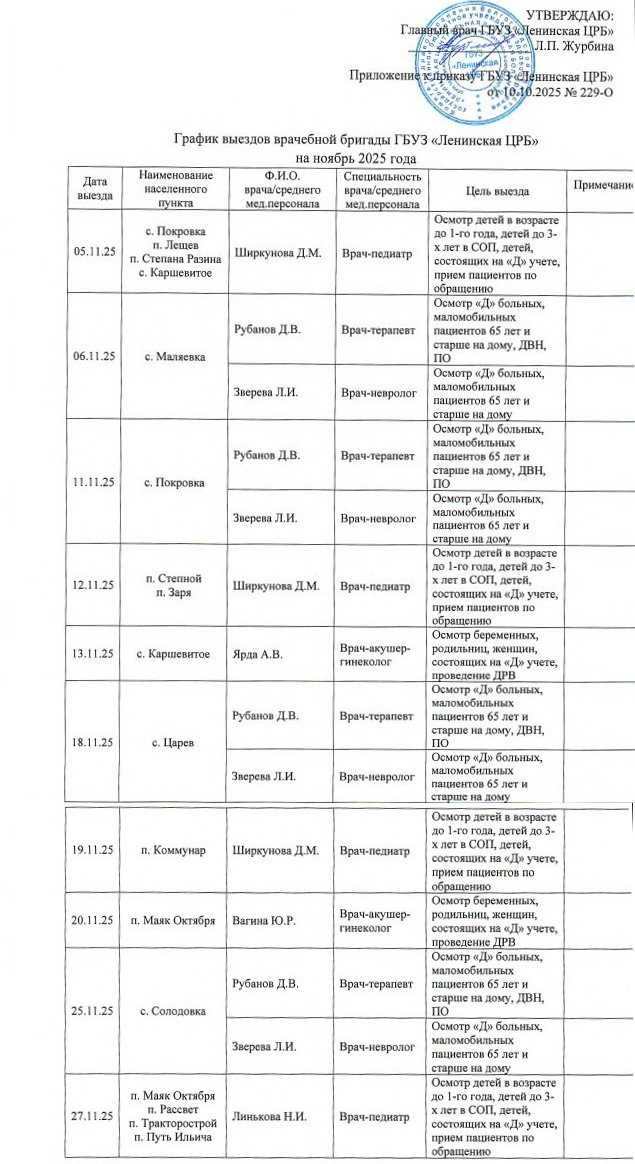 График выездов врачебной бригады ГБУЗ «Ленинская ЦРБ»